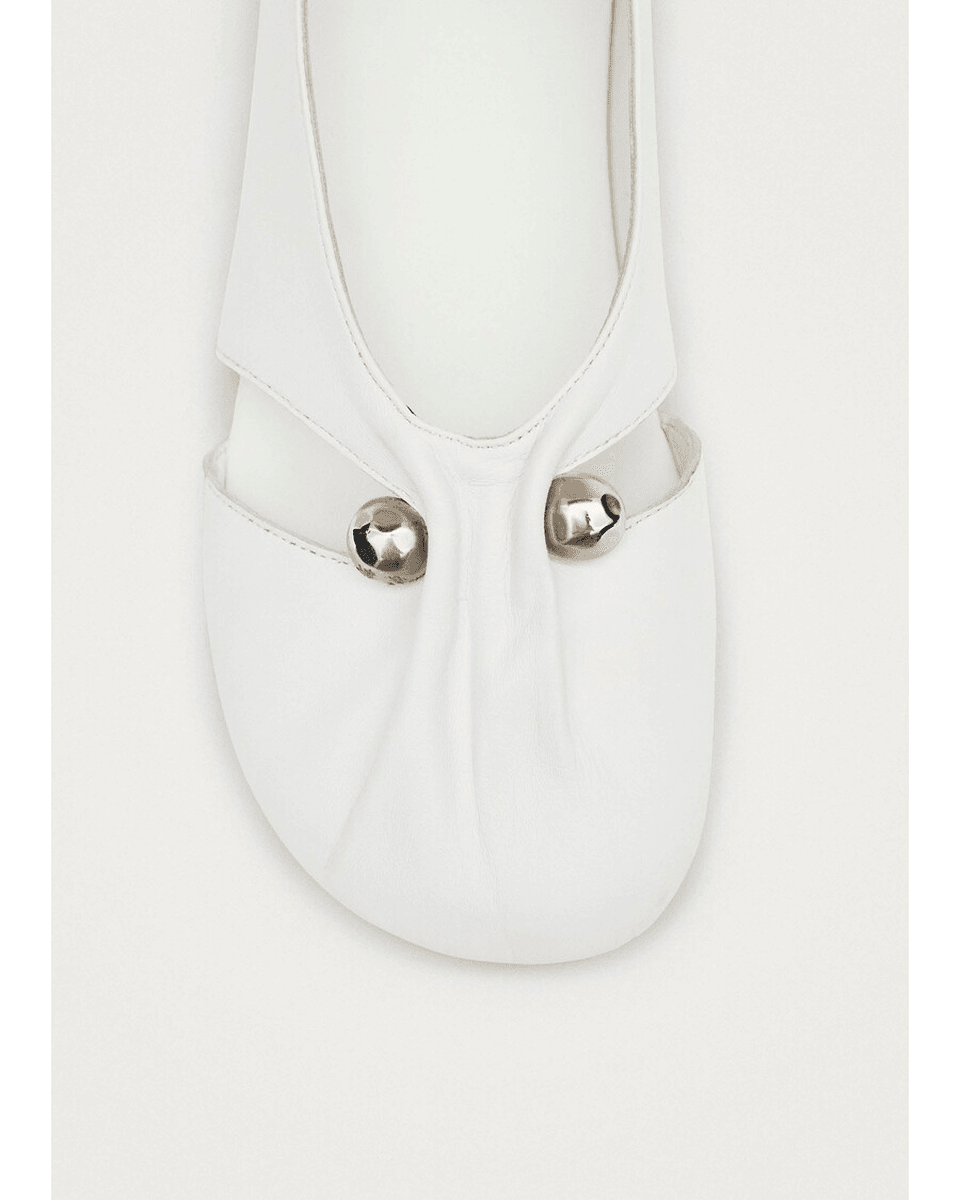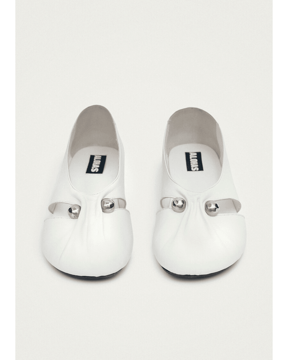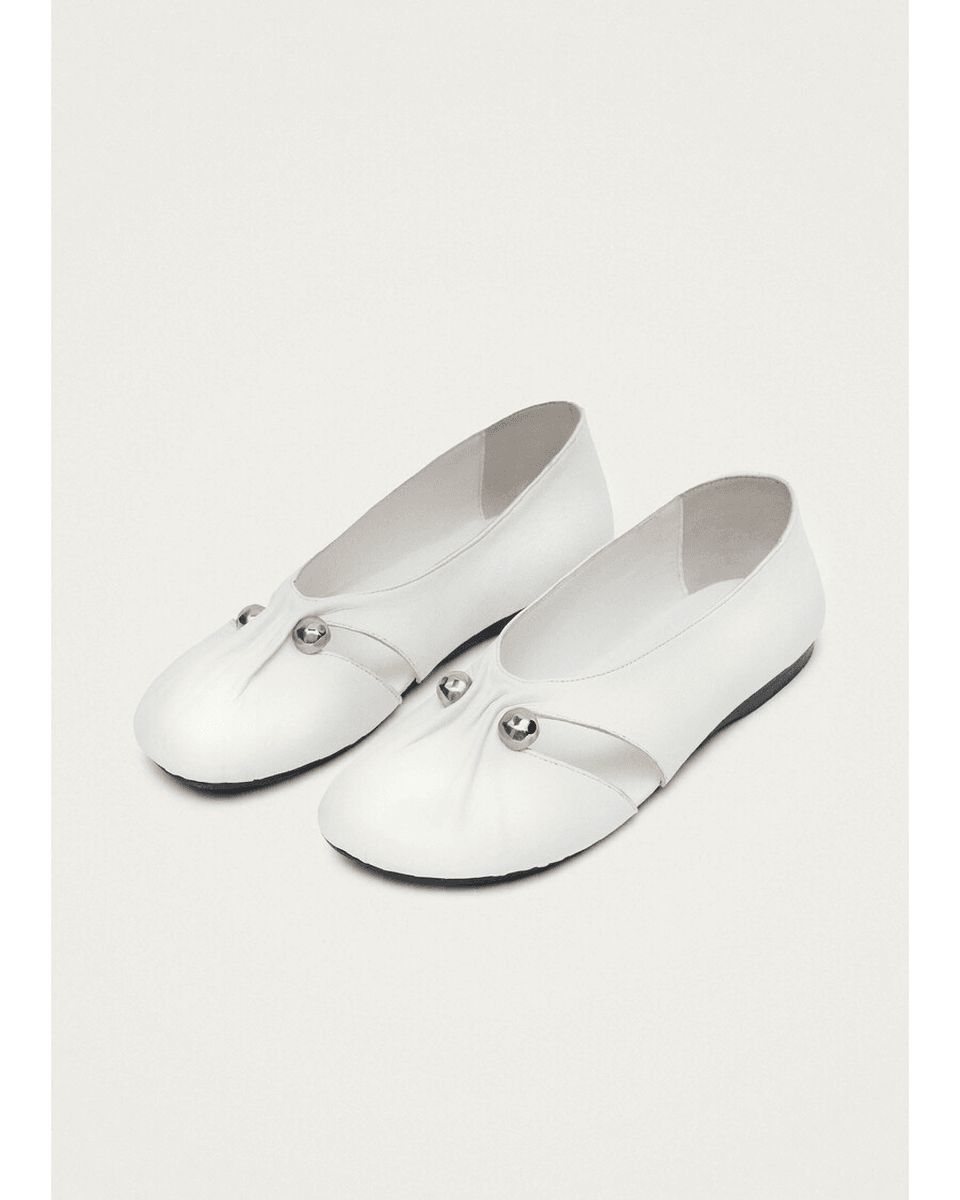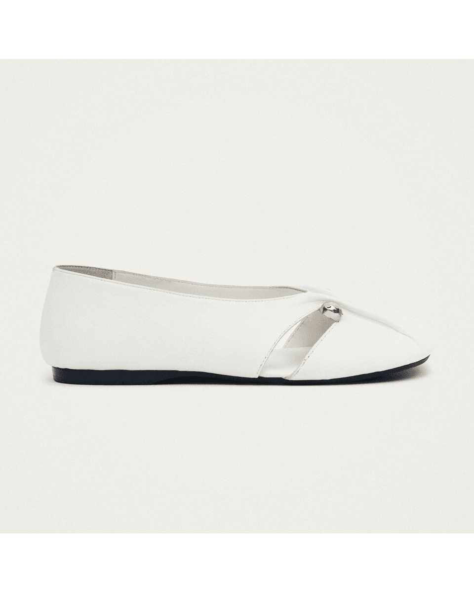 The Alohas Ravena White Leather Ballet Flats showcase a timeless rounded-toe silhouette that flatters every foot. The elegant silver hardware accents enhance the overall aesthetic, while the vertical cut-outs introduce a subtle wrinkle effect that adds depth to the design.