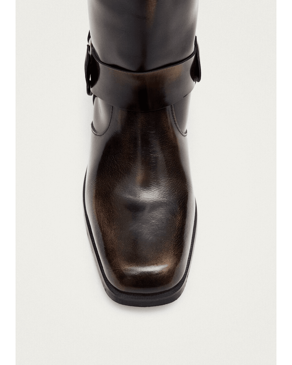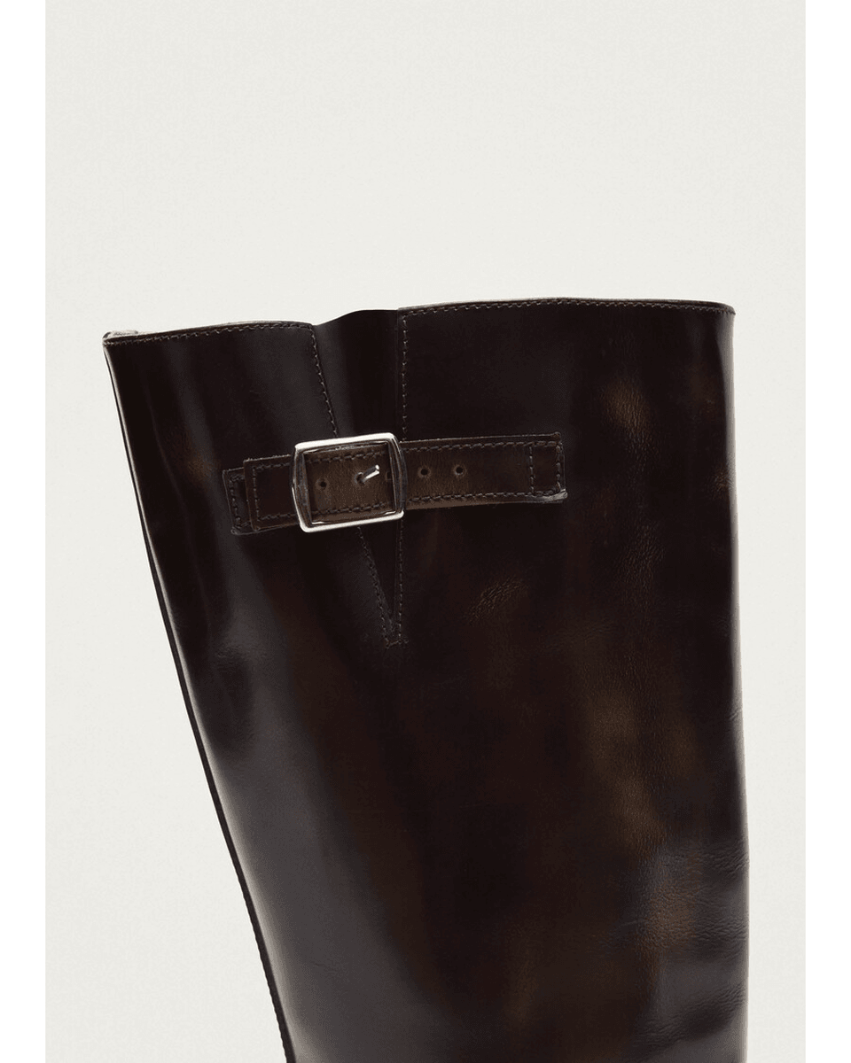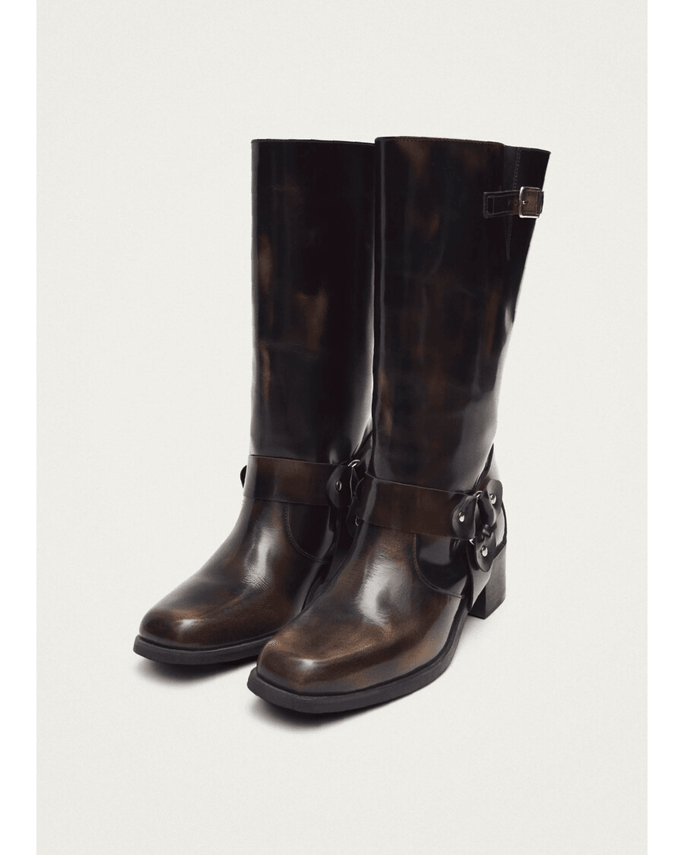 The Alohas Rocky Brushed Brown Leather Boots are not just a footwear choice; they are a fashion statement. With their low chunky heel, these boots provide the perfect blend of comfort and style. The buckles and riveted straps add a touch of rugged charm, making them ideal for both casual outings and trendy events.