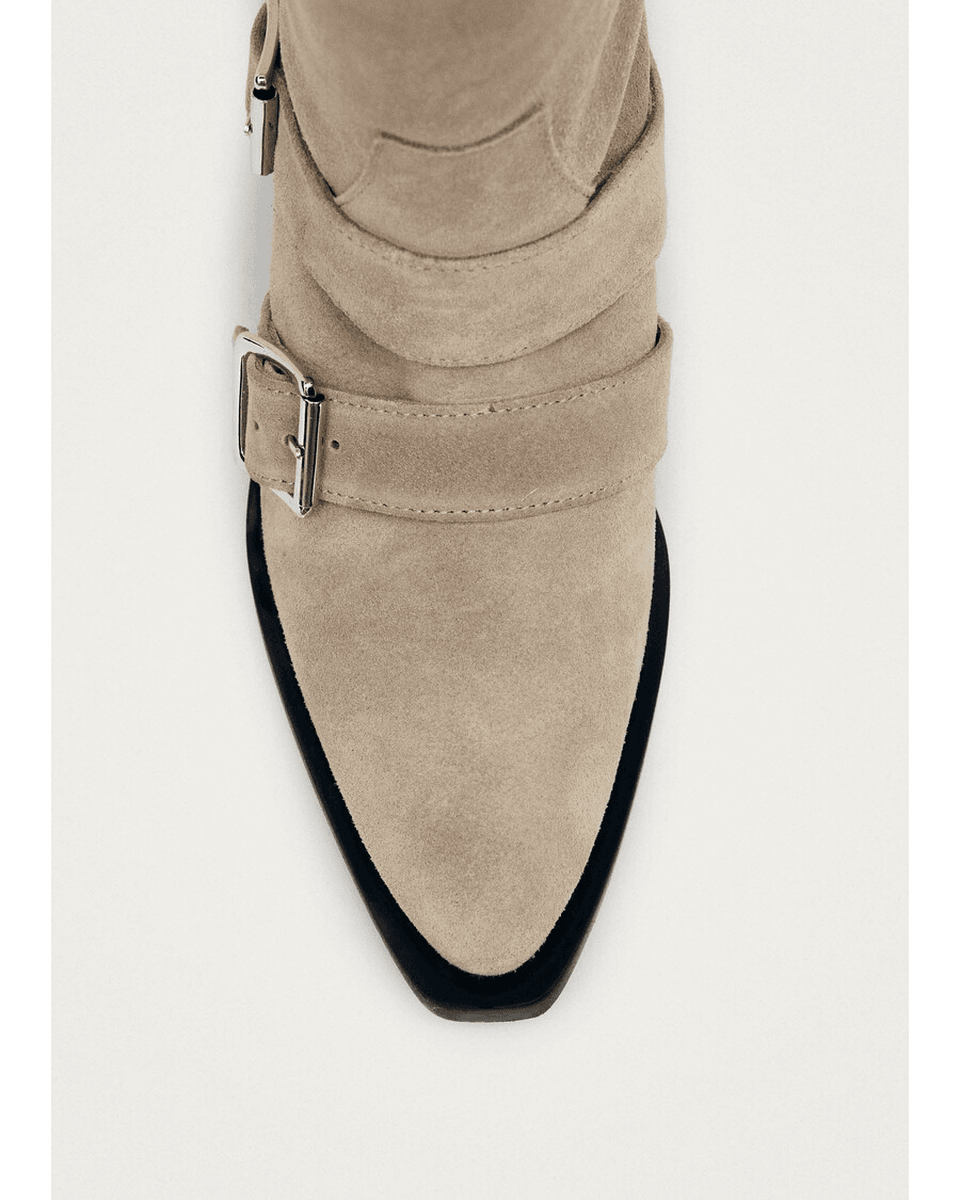 The Alohas Ryder Suede Beige Leather Boots are not just footwear; they're a statement. The combination of the pointed toe and cowboy heel provides a unique blend of elegance and ruggedness. The silver buckles enhance the overall aesthetic, making these boots suitable for both casual outings and more polished events.