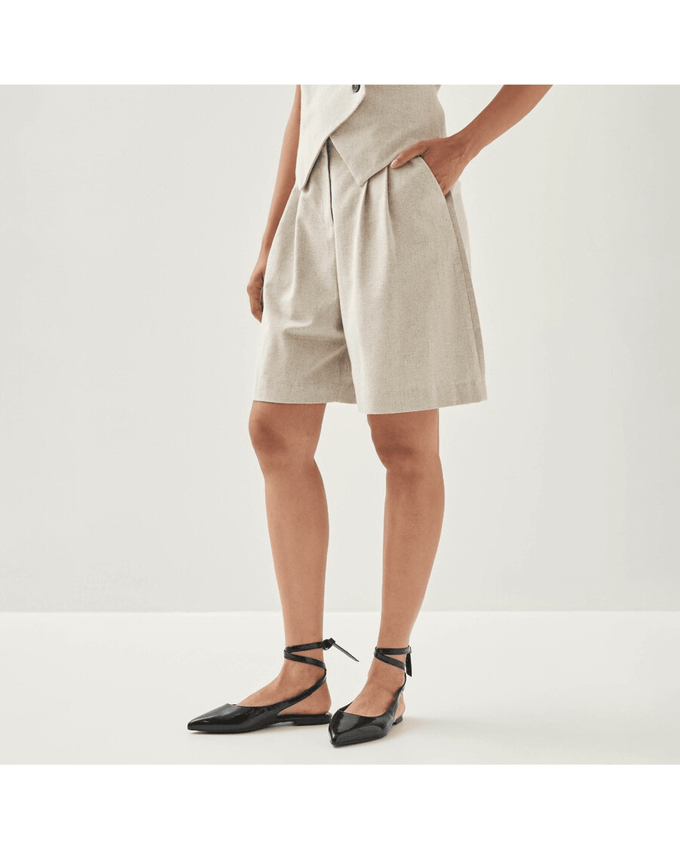 τα αλόχας νισέλ κρεμ σορτς κάθονται ψηλά στη μέση, παρέχοντας μια κολακευτική εφαρμογή που ταιριάζει όμορφα με οποιοδήποτε τοπ. κατασκευασμένα από Premium οργανικό βαμβάκι, αυτά τα σορτς είναι όχι μόνο κομψά αλλά και φιλικά προς το περιβάλλον. η σχεδίαση με φαρδιά πόδια επιτρέπει την ελευθερία κινήσεων, κάνοντάς τα ιδανικά τόσο για Casual εξόδους όσο και για πιο επίσημες περιστάσεις.