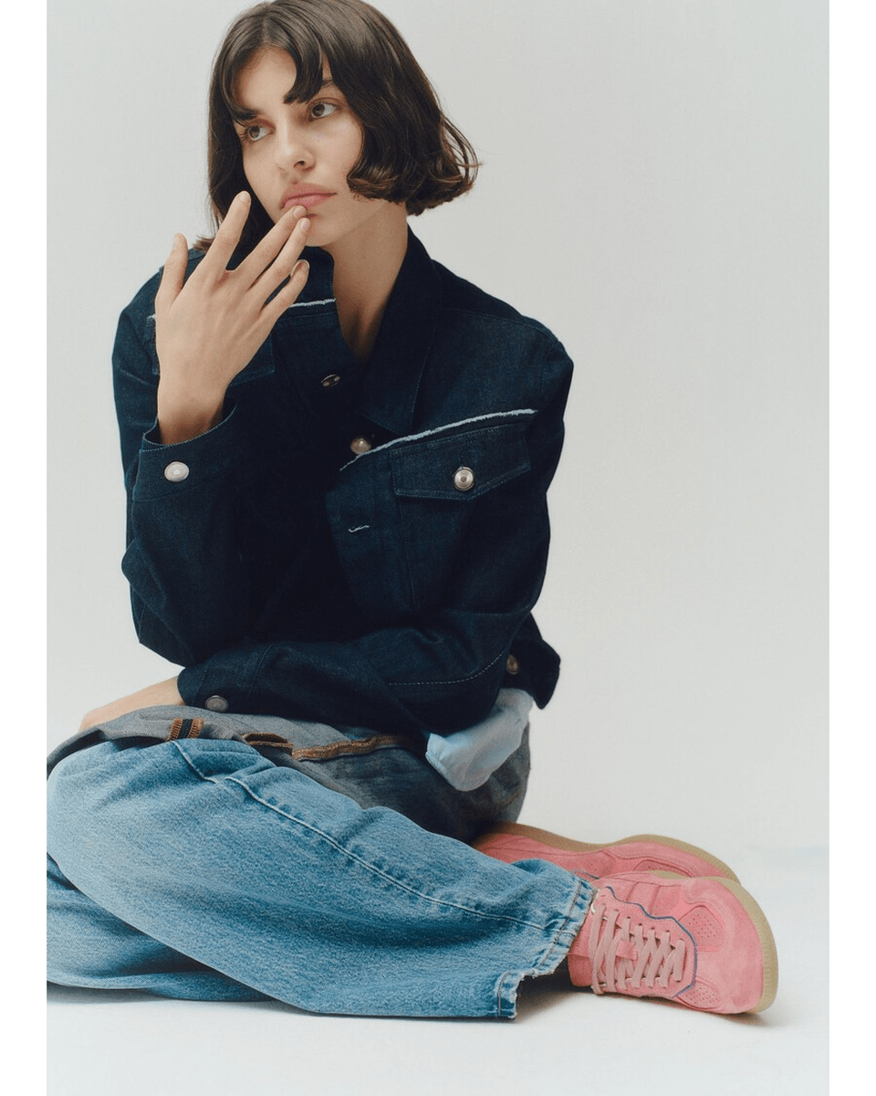 - opvallend Ontwerp: Felroze Suede Met Opvallende Blauwe Leren Bies.