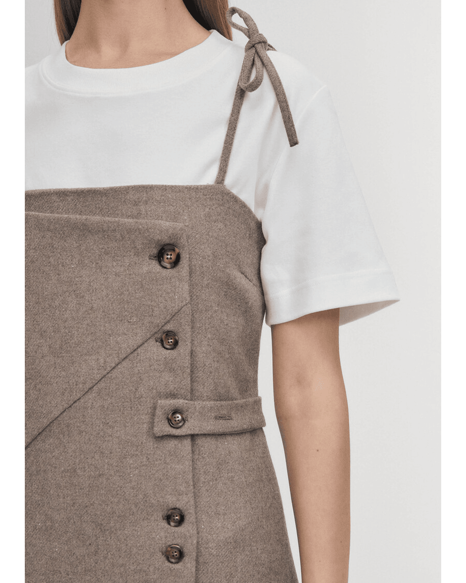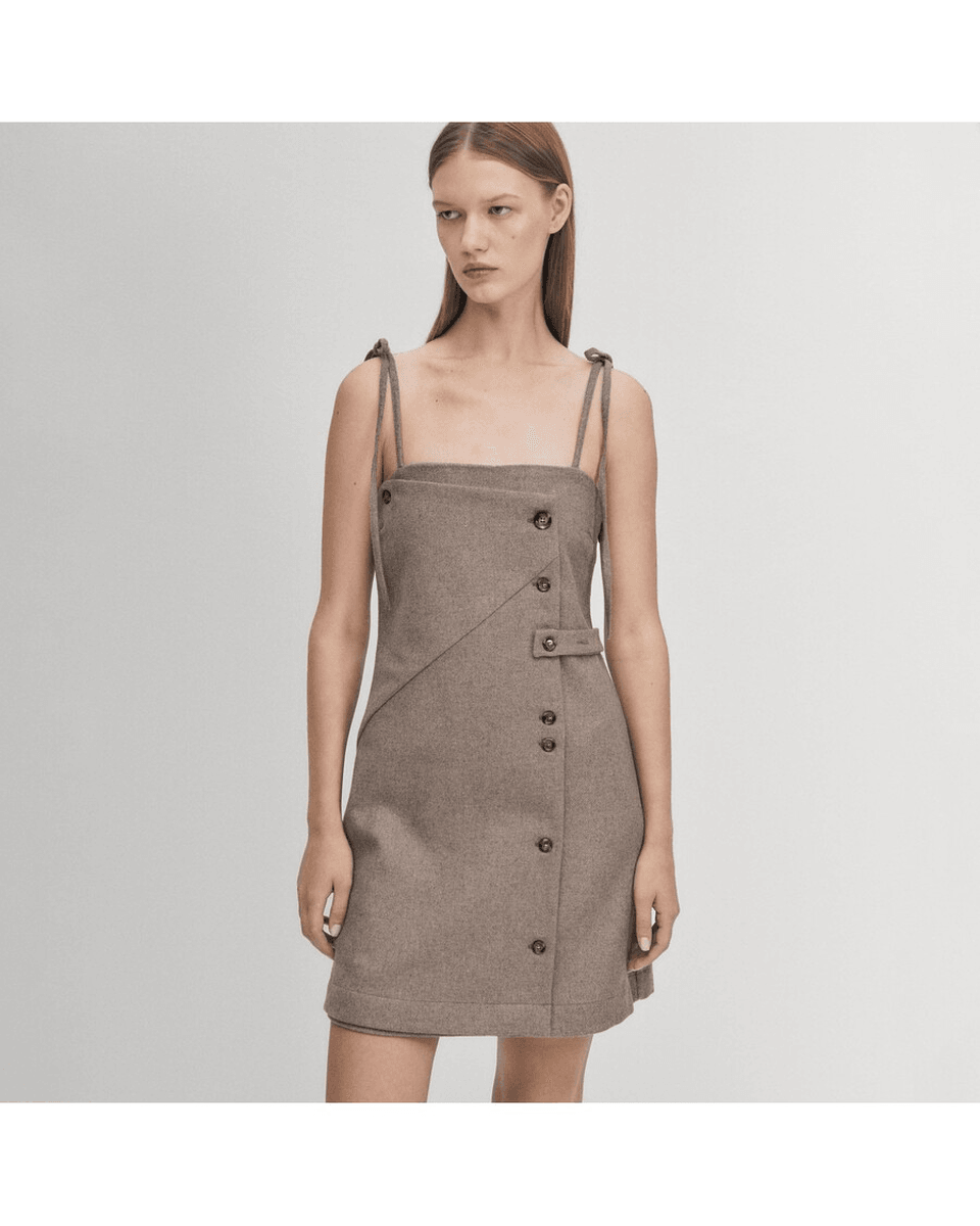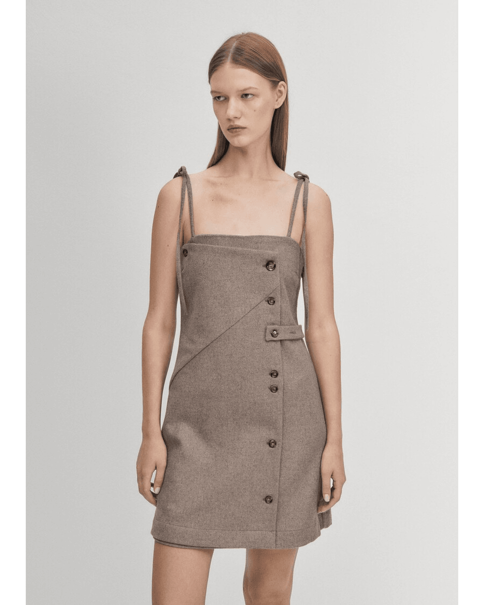 rochie taupe Gala Alohas Este Realizată Cu Măiestrie Dintr-un Amestec Luxos De Lână Taupe, Asigurând Atât Confort, Cât și Stil. Croiala Sa Dreaptă și Talia Ușor Ajustată Creează O Siluetă Sofisticată Care Flatează Toate Tipurile De Corp. Decolteul Unic Bandeau Cu Bretele Subțiri Se Leagă în Fundițe Fermecătoare, Adăugând O Notă Jucăușă Acestei Rochii Mini Elegante.