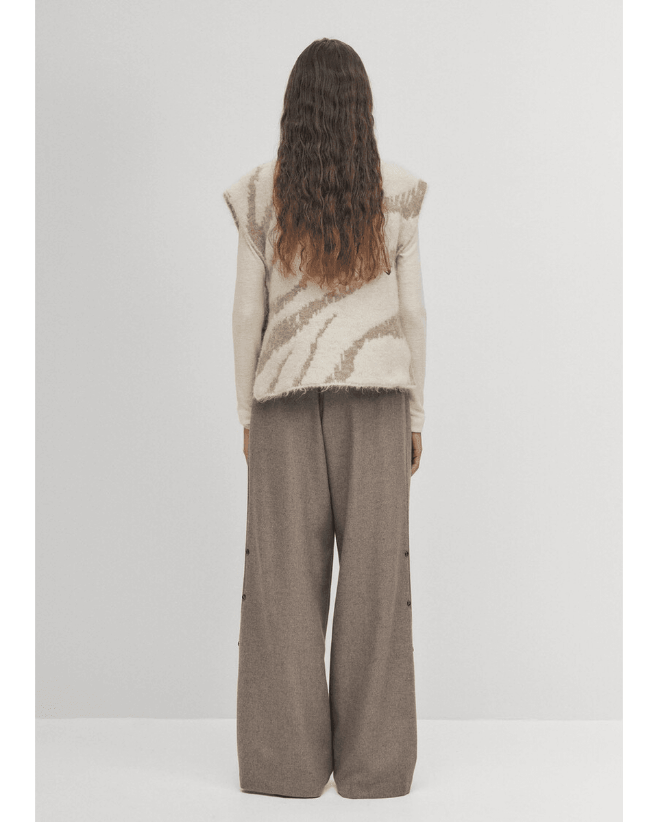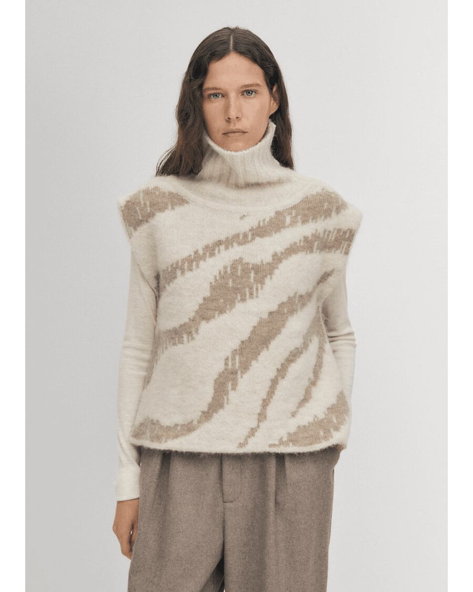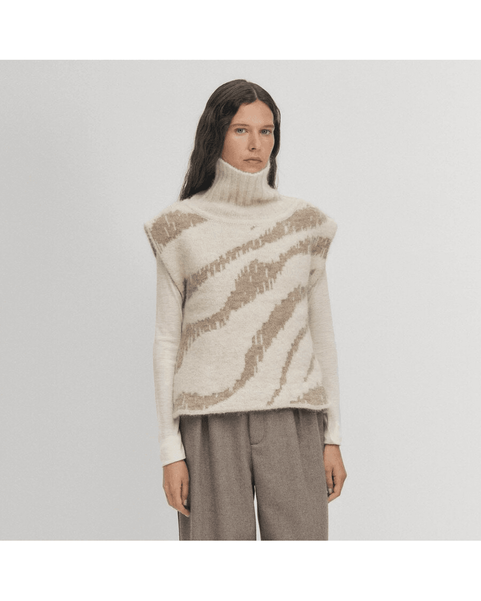 откройте для себя потрясающий жилет Alohas Bergen Ecru, обязательный элемент вашего гардероба, который сочетает в себе элегантность и универсальность. этот безрукавный жилет из шершащей смеси цвета э크рю имеет стильный высокий воротник, идеально подходящий для многослойности и создания выразительного образа.