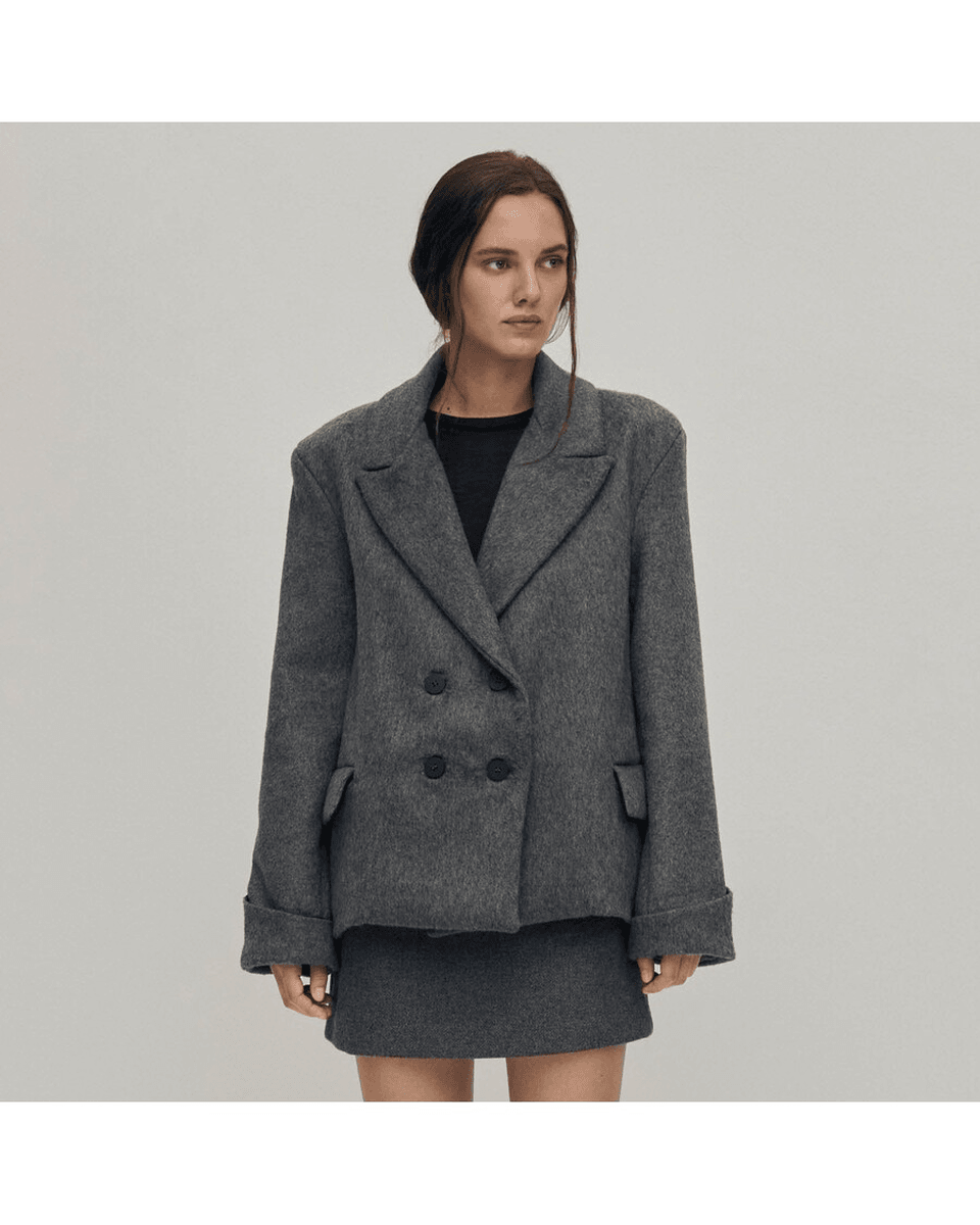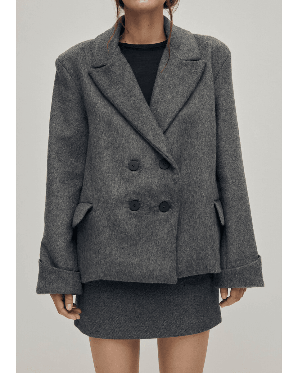 podignite Svoju Garderobu Sa alohas Mei Sivim Kaputom, Zapanjujućim Oversized Blejzerom Koji Redefiniše Klasične Grašak Kapute. Izrađen Od Premium Vune-feltona, Ovaj Kaput Nudi šik, Skraćenu Siluetu Koja Je Savršena Za Slojevito Oblačenje.