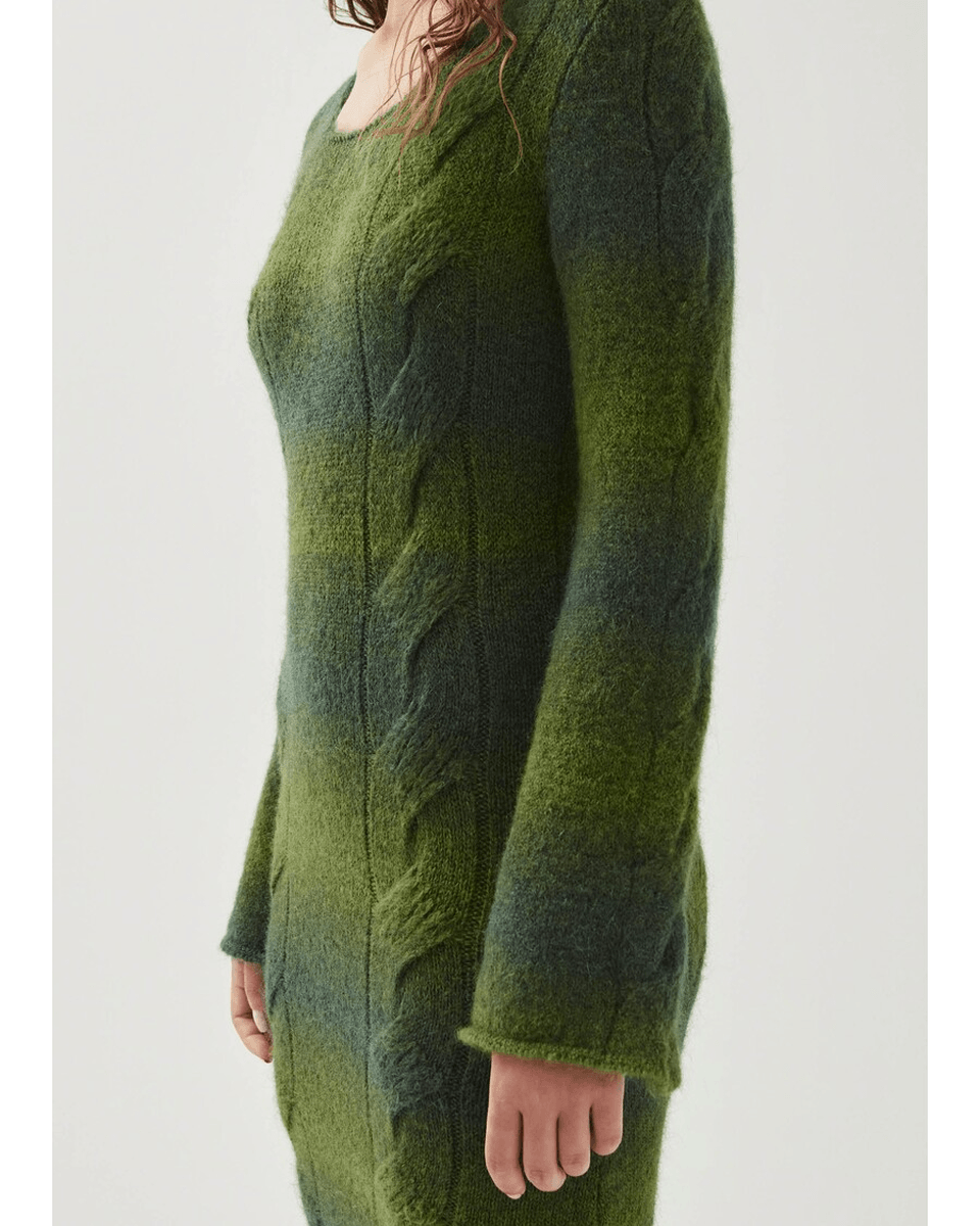 alohas Trenza Zelena Haljina Je Pažljivo Izrađena Sa Spojem Udobnosti I Stila. Složeni Detalji Pletenice Protežu Se Duž Prednje Strane, Leđa I Rukava, Pružajući Taktilno Iskustvo Koje Ovu Haljinu Uzdiže Na Nove Visine. Njena Dužina Do članaka Nudi Gracioznost Dok Osigurava Da Se Osećate Samouvereno I šik.